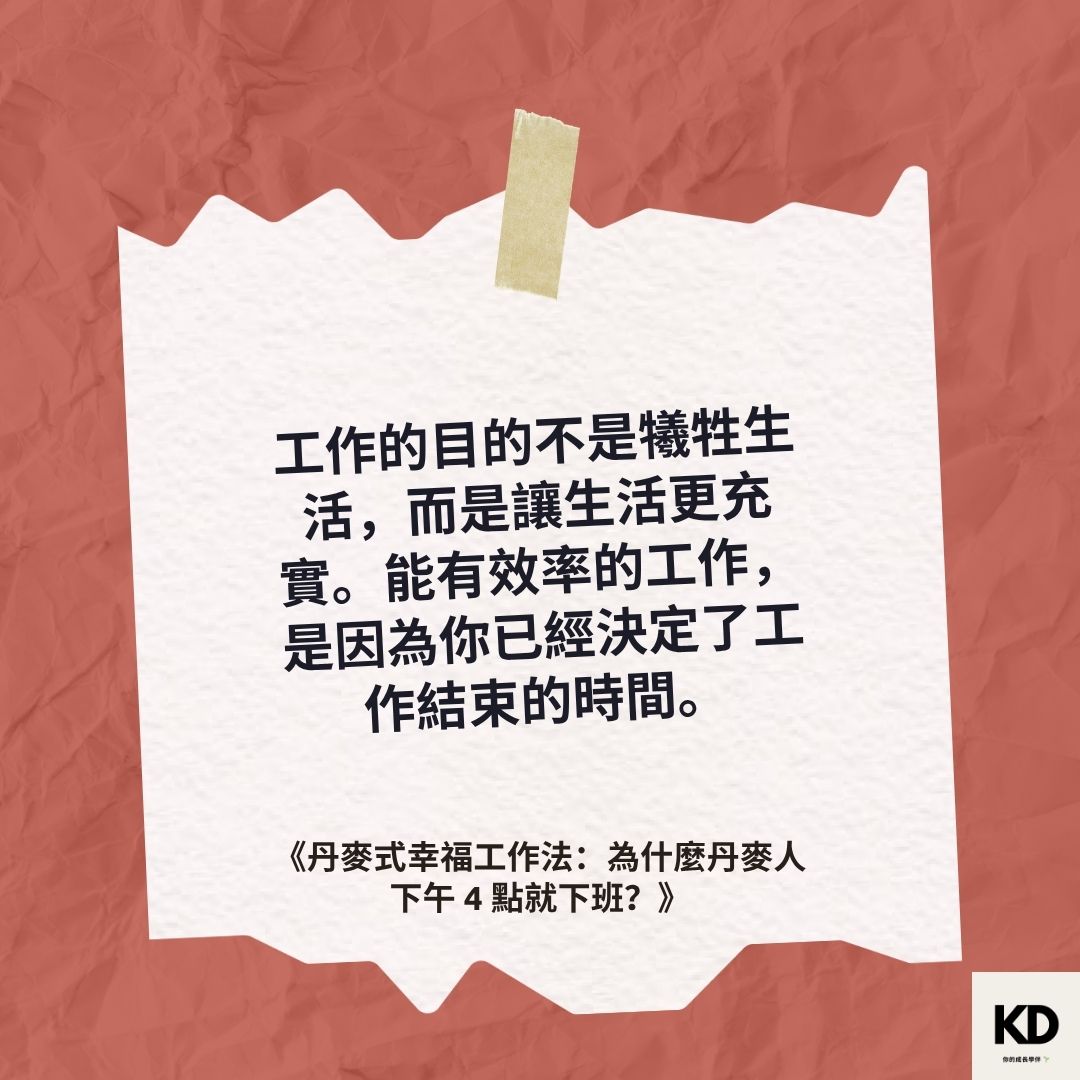 - 決定工作方式的關鍵是「人生的優先順序」,丹麥人勇於取捨以享受與親友共處的美好時刻,追求工作與生活平衡。