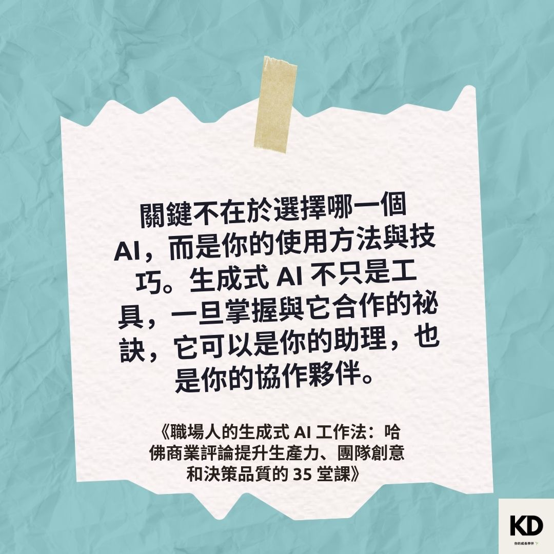 「關鍵不在於選擇哪一個 AI,而是你的使用方法與技巧。生成式 AI 不只是工具,一旦掌握與它合作的祕訣,它可以是你的助理,也是你的協作夥伴。」