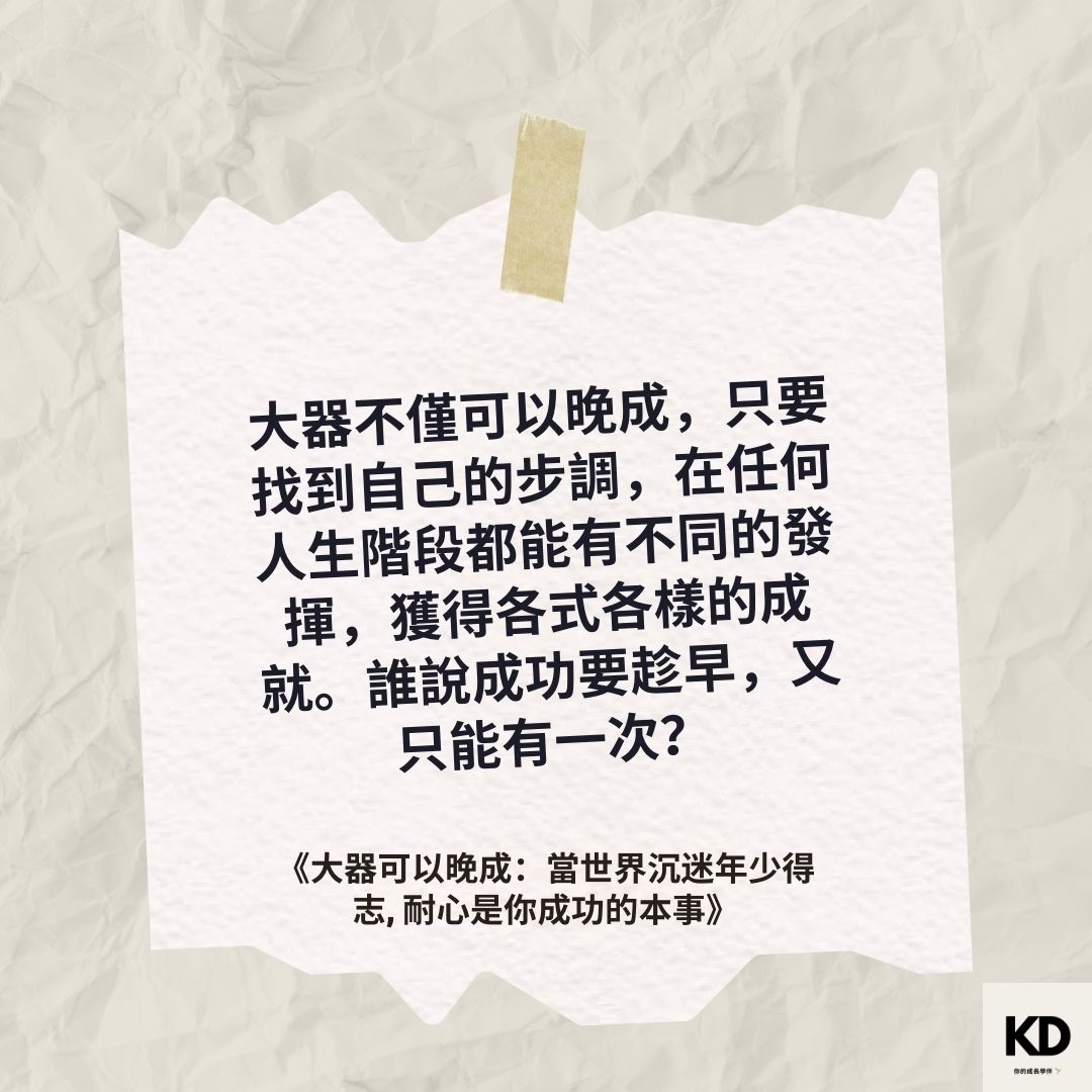 「大器不僅可以晚成,只要找到自己的步調,在任何人生階段都能有不同的發揮,獲得各式各樣的成就。誰說成功要趁早,又只能有一次?」